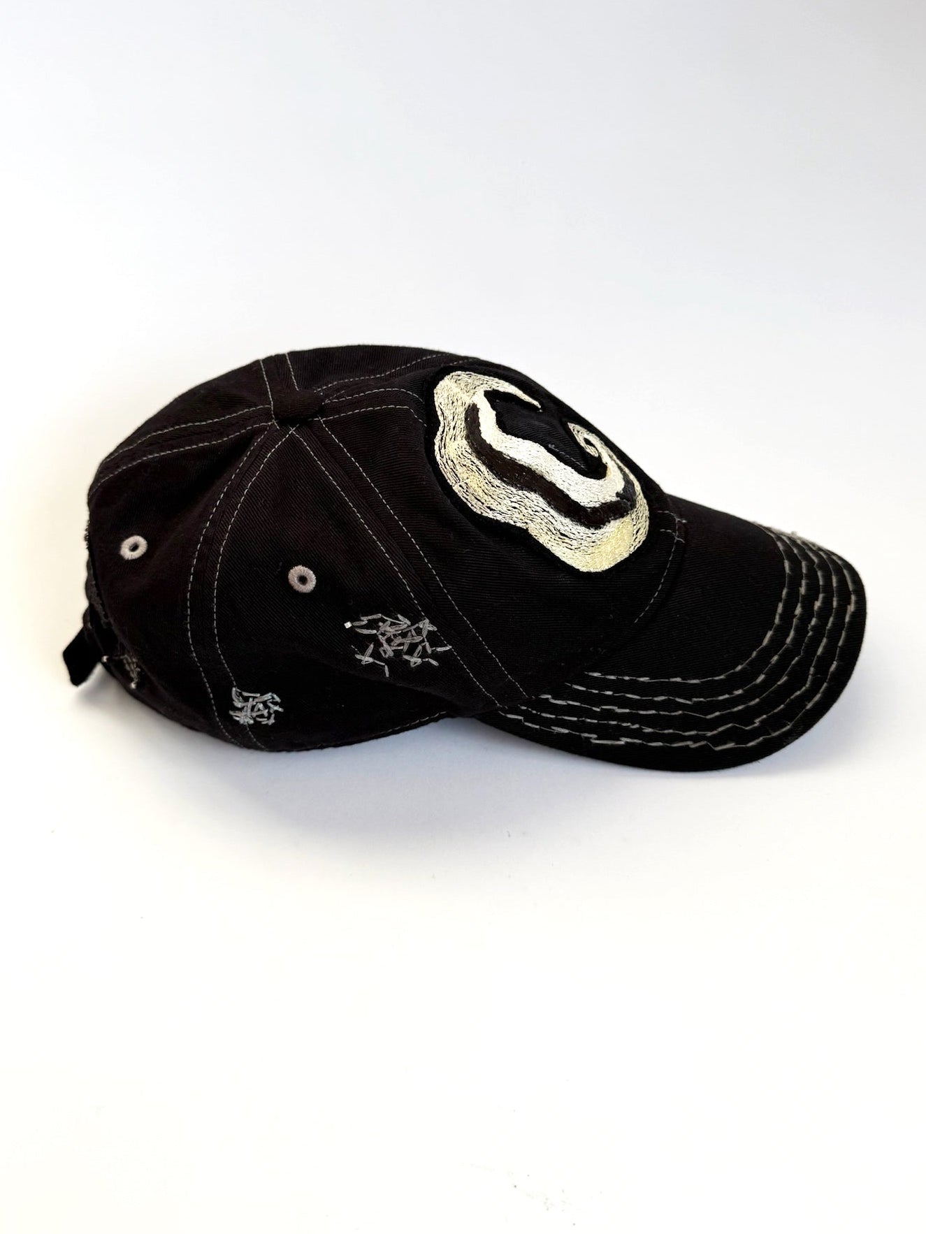 Cosmo Era Foil Cap in Black features an embroidered signature C in shades of white and creme with black foil detailing. Stitching throughout is in charcoal grey. The subtle details include metallic thread stitches and tiny glass beads that catch the light.